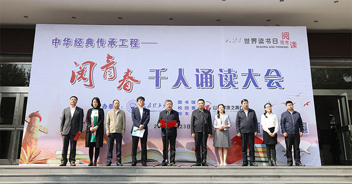 第24个“世界读书日”到来之际,4月23日下午,由我校和山西广播电视台共同举办的中华经典传承工程---“阅青春”千人诵读大会在迎西校区、明向校区同时举行。校党委书记吴玉程,副校长梁卫国;山西广播电视台党委委员、副总编辑罗庆东,山西健康之声广播陈湘等在迎西校区图书馆孔子像广场出席大会。我校党政有关职能部门负责人,省内著名节目主持人、朗诵家和师生代表等参加了诵读大会。梁卫国主持“阅青春”千人诵读大会暨2018年度“读者之星”颁奖仪式。