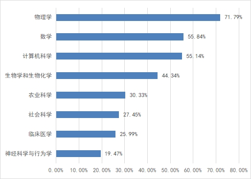 一个学科能否进入全球前1%,取决于这个学科近十年SCI/SSCI论文的总被引频次,不同的学科门槛值不同。学科潜力值是指各学科被引频次值与ESI被引门槛值的比值,截至2023年5月更新数据,我校部分学科进入ESI前1%的潜力值如图1所示,其中物理学的潜力值最高,达71.79%(上期71.38%),其次为数学,潜力值达55.84%(上期53.45%)。