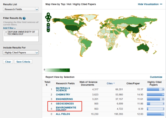 截止目前,太原理工大学进入ESI全球前1%的学科增至5个,包括工程学、材料科学、化学、地球科学、环境与生态学,其中,地球科学学科领域,我校为全省唯一入围机构,这是我校学科建设取得的又一重大突破。