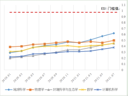 根据ESI数据库7月更新数据,在ESI的22个学科分类中,我校目前有3个学科进入全球的前1%,分别为工程学、材料科学、化学。同时,我校ESI潜力学科潜力值变化趋势(前5)如图1所示,地球科学作为我校最具潜力学科,潜力值为0.62。
