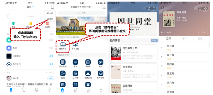 2、读者使用手机号注册进行单位认证,务必真实填写,以免错失获奖机会(如已注册认证,可忽略此步骤),首页右上角点击输入邀请码“tylgdxtsg”进入本馆首页,即可查看本次活动专区。点击“推荐书目”,可阅读部分推荐书目图书全文。