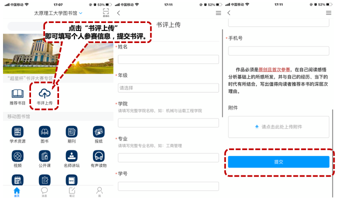3、点击“书评上传”,填写信息,提交书评。注意事项:书评提交每人只可提交一次,提交后如有问题,可进行修改。