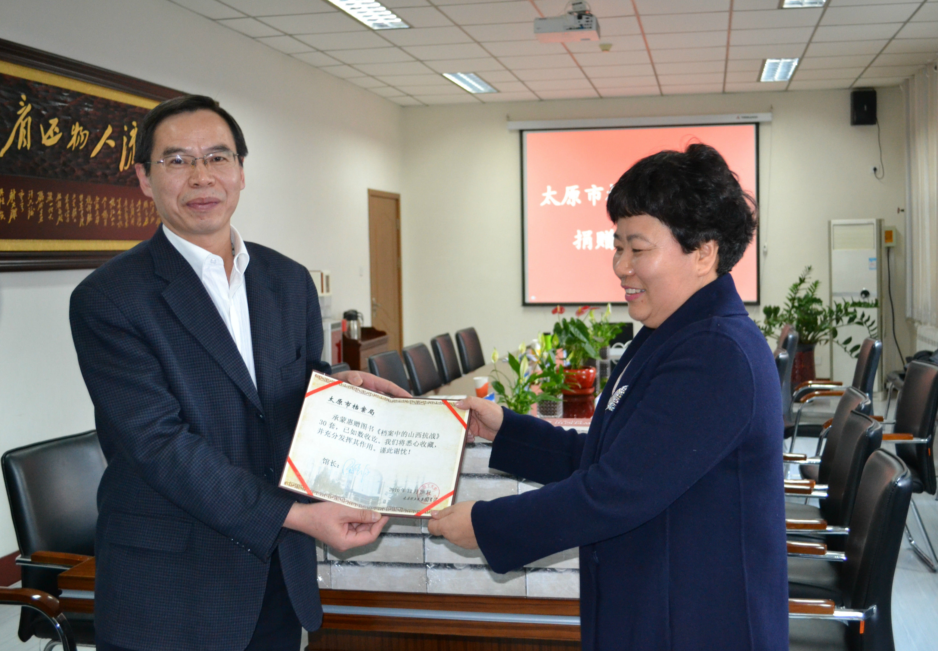 图书馆馆长秦晓怀代表学校接受捐赠,并为太原市档案局颁发了赠书证书。