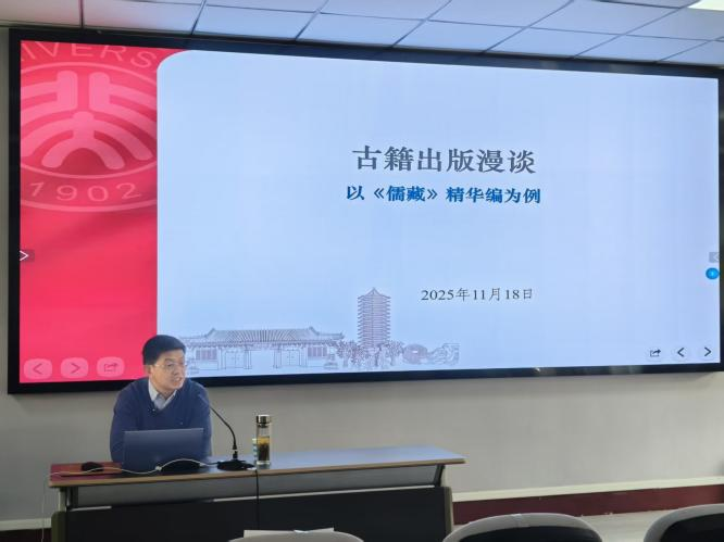 本次活动特邀北京大学出版社副总编辑、编审马辛民担任主讲嘉宾。马辛民以“古籍出版漫谈──以《儒藏》‘精华编’为例”为题,系统梳理了中国古籍整理出版工作的脉络与意义。他结合本人主持的《儒藏》“精华编”、《大仓文库粹编》等国家重大项目,生动揭示了一部权威古籍著作从文献调研、校勘整理到最终成书出版的完整流程,为在场师生打开了了解古籍整理与出版的窗口。
